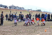 温かい日差しの中、中鶴少年ラグビークラブさんとの交歓会が開催されました。 3年生として最後の試合。練習した成果をしっかりと発揮することを目標に試合に挑みましたが、試合終了まで体力を持続することが出来ず、少し悔しさの残る試合結果となってしまいました。コーチからは、「パス回し、ロングリリースは出来るようになってきた。ディフェンスの時は、もっとみんなで前に出て、タックルをしよう。」とご指導いただきました。今後も練習を積み重ね、仲間とともに成長してほしいと思います。コーチの方々をはじめ、関係者の皆様ありがとうございました。 最後になりましたが、中鶴少年ラグビークラブの皆様、素晴らしい交歓会をご準備いただき、ありがとうございました。 |