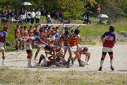 秋晴れの陽気が心地よく感じられる中、準々決勝を迎えました。 対戦相手は玄海さん。ディフェンス、オフェンスともに優れており、キック力を生かした攻撃をされるチームであるため、この試合を意識して練習に励んできました。 試合では、相手に先制トライを取られるなど前半はリードされてしまいました。しかし、『戦う気持ち・諦めない気持ち・劣勢を跳ね返す強い気持ち』を最後まで持ち続けて戦い、後半は見事逆転し勝利を収めることができました。 今後もっと厳しい戦いになると思います。怪我をしている子、メンバー外の子、スタメン入りした子。立場はそれぞれですが、気持ちを一つにし、チーム力を上げて今後の試合に臨んでいきます。 |